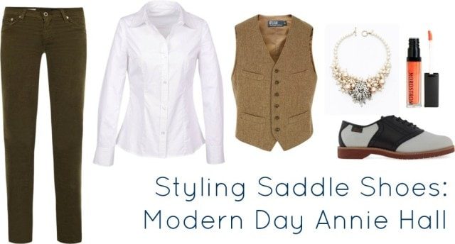 Put a modern spin on Annie Hall by pairing saddle shoes with shrunken classics with a menswear vibe. Skinny cords or jeans in a neutral tone, a tailored white shirt and tweed vest work with the shoes without the ensemble looking too cliché. Balance the masculine with feminine touches – a pearl statement necklace peeking out of the neckline and glossy lip with an otherwise fresh face.