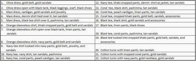I focused on pants since they offer more modesty than a skirt. Don’t be afraid to pair a dress with a pair of pants; this is similar to a selwar kameez and will be conservative and comfortable. The black skirt is below knee, the navy skirt full length. Either can be worn casually or dressed up. For day, pair with an untucked top and sandals, for evening tuck in, add the gold belt and accessories. The olive dress can also be easily dressed up with the addition of gold accessories.
