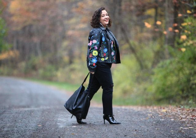 My friend Carletta shared this very jacket on Twitter the other week, annoyed that the only real leather jacket ASOS offered in plus sizes was covered in embroidered flowers. I didn't realize when I bought this jacket back in March that it was the only plus size leather offering, I was just in awe of all of the embellishment. Because there's two Allies, one who likes tasteful and stylish, and the other who feels more is more. And this outfit is more.