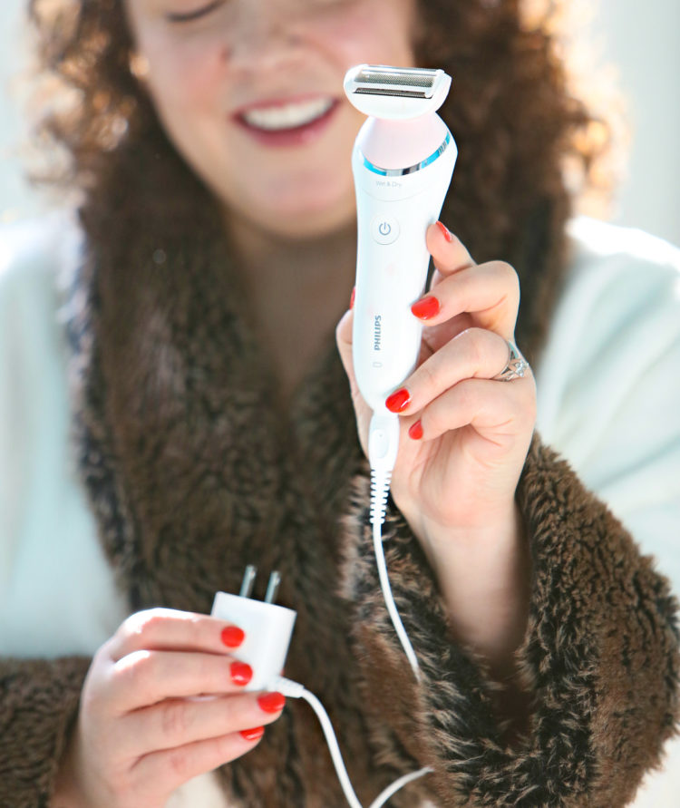 I don't know if it's due to looser skin or aging eyes, but I don't seem to get as close of a shave as I used to. I miss spots, end up with stubble in places I swore I shaved carefully, and am prone to nicks in terrible places like behind my knee or my bikini line. My husband suggested switching to an electric razor which he did last year after years using a straight blade and also finding himself starting to experience nicks and irritation. I was researching the best electric razors for sensitive skin when I was offered the opportunity to test out the Philips SatinShave Advanced Wet & Dry Women’s Rechargeable Electric Shaver and share my experience with all of you.