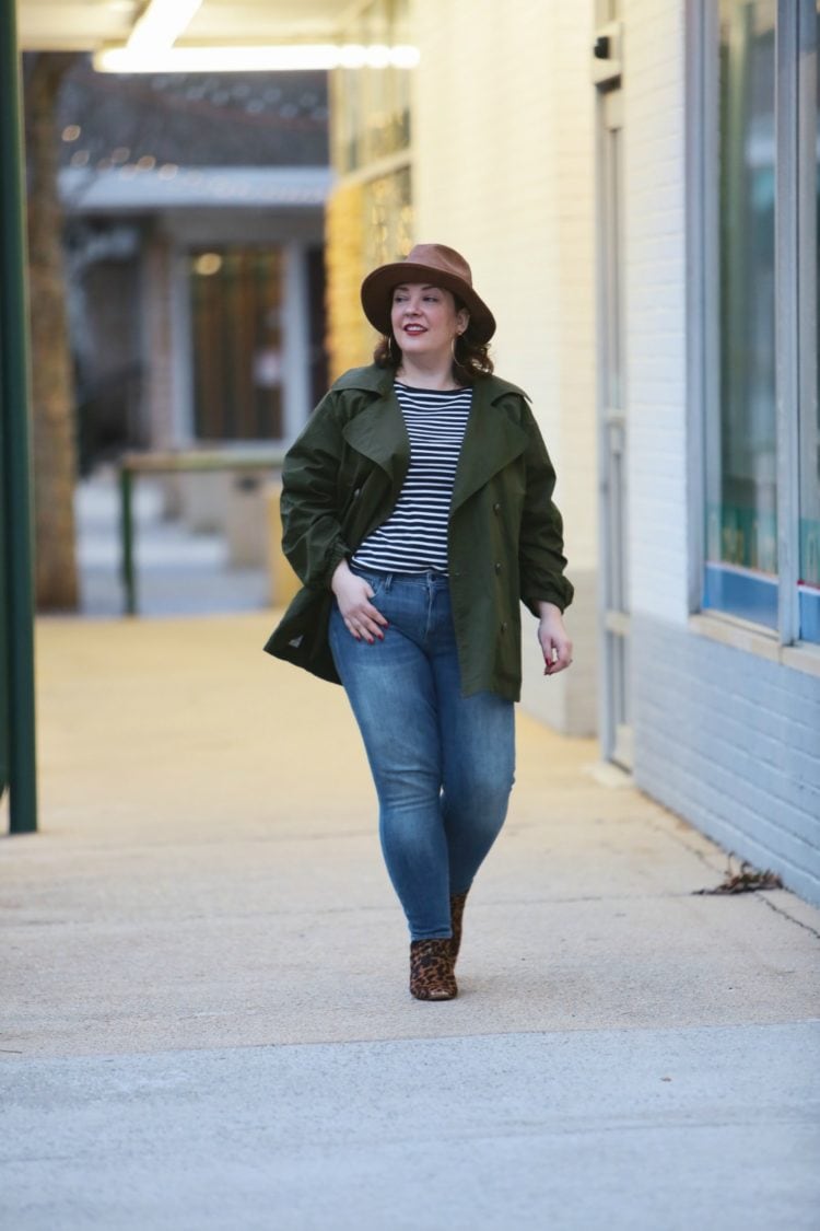 When working from home, I like to wear comfortable clothing with stretch but things that can easily look put together when I leave the house. Jackets are a perfect way to make separates feel like an outfit but they don't always have to be a blazer. I recently received the Expedition Jacket from cabi and love how I can throw it on over skinny jeans or leggings and look boho casual yet more pulled together than if I threw on an old cardigan or hoodie. I'm not a utility jacket kind of gal; I've bought many over the years but I never feel myself in them. This one I like because it's not utilitarian at all, the only similarity is the color and fabric. cabi has the jacket styled with a belt cinching it and I've found I also like that effect… I'll likely try it that way this spring with white jeans. But for a rainy yet not cold day I felt it was perfect to throw over stretchy jeans and a striped tee.