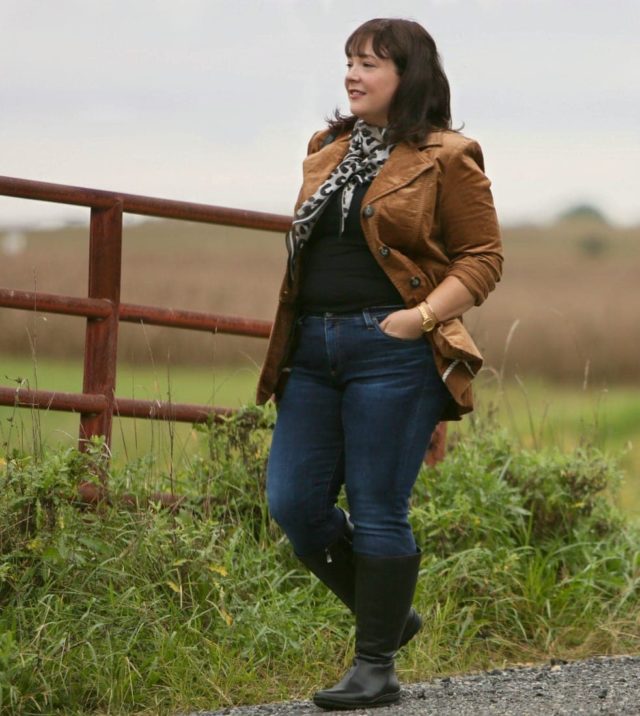 Jacket: Journey Jacket c/o cabi (L; plus size alternative) | Top: V-neck Cami c/o cabi (L; plus size option) | Jeans: AG (32; plus size option) | Scarf: Leopard Scarf c/o cabi | Boots: DUO Boots (old; similar) | Earrings: Cassie Hoops c/o Chico's | Bracelet: Metal Marvels | Watch: Metallic Watch c/o LOFT | Bag: Quilted Chain-Strap Handbag c/o Talbots