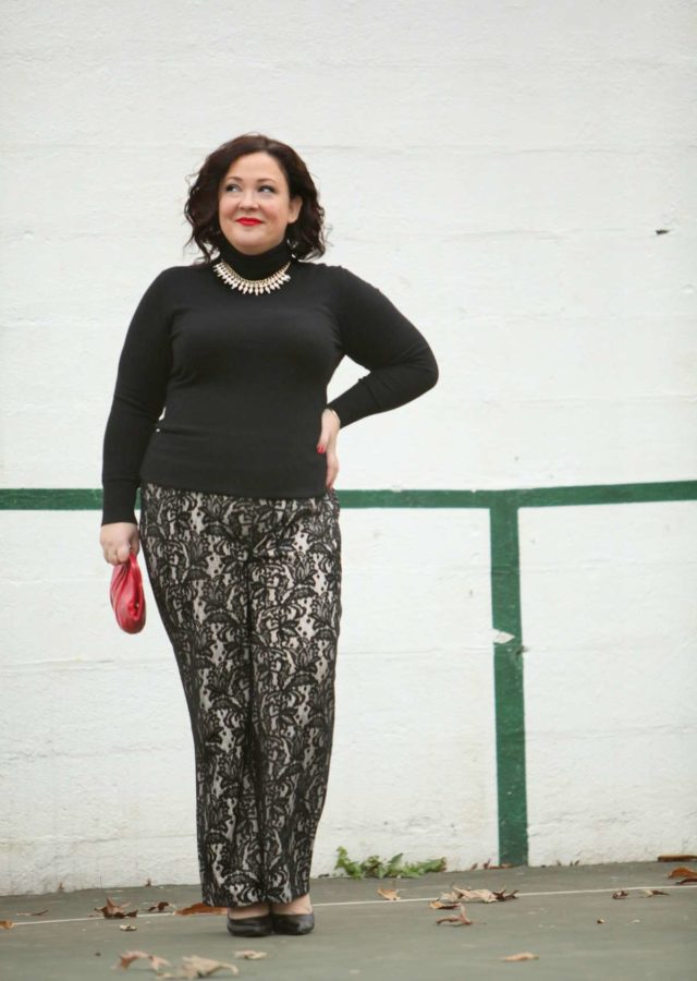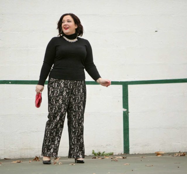 I believe in buying a few trend pieces to work with staples already in your wardrobe. Catherines' Black Label Lace Pant (size 0X) is exactly that. With a luxe lace overlay and classic cut, these are pants that will glam up many items already existing in your closet. While I paired them here with a black cashmere turtleneck, they would also look great with a cream ruffled blouse, ivory blazer and black shell, black silk blouse, drapey black knit top, or get extra festive and style with a red sweater or top. Add a sparkly necklace and a red lip and you're ready for your next holiday get together.