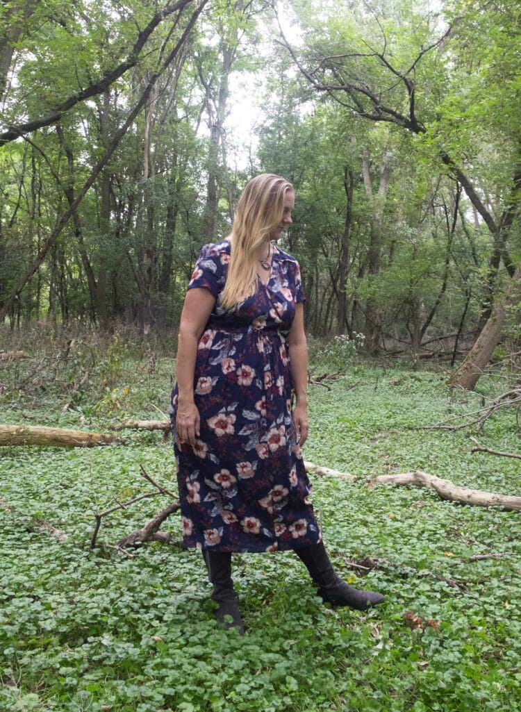 The Dawn Dress has the same top as the Dawn Jumper, but a full midi skirt instead of wide-leg pants.  I remembered how giant the top was on my jumpsuit, so I opted for a size large in the dress, in the large scale floral print “Night Anemone”.  This is one of the styles from Christy Dawn available in extended sizes 1X-3X. The Dawn Dress is also available in Petites XS-XL.