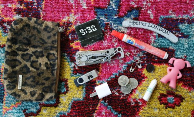 A pack of matches (never know when you'll need a light), nail file, Tide to Go pen, a Leatherman, thumb drive (swag from a blogger event), a USB cord plug, emergency quarters for meters, safety pins, a random button I don't know what from, emergency tampon, and a little gizmo my sister gave Emerson that turns chopsticks into tweezers (highly recommend).