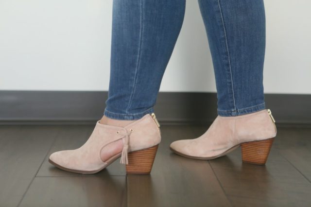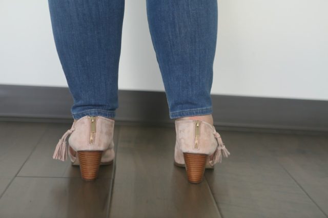 I love the look of a suede ankle bootie in a low-contrast color.  They're so versatile. Wear with dresses and elongate the leg, look chic with jeans. However, as one with not just wide feet but wide ankles, it's hard to find booties that don't create a muffin top on my ankles if they can even zip up completely. I had a pair of beige suede ankle booties from Clarks but they were worn to death and retired. So I was excited to see these booties in my Trunk.  And these fit… dare I say they're too wide (I NEVER say such a thing). They're also super comfortable. However, they're not right for me.  The cutout looks cool… but then how do you wear socks to keep your feet from funking up the booties and to keep your feet warm as the temps drop? Also the tassels bother me. I think the back view is weird with the zippers and the tassels and the stacked wood heel… it's a lot for what I want to be a low-contrast neutral shoe.  I think I'd appreciate these details more in black (this bootie comes in black as well as this blush color). So while these made me super excited because they fit, they're going back. This bootie retails for $124.95 and comes in narrow, medium, wide, and extra wide widths.