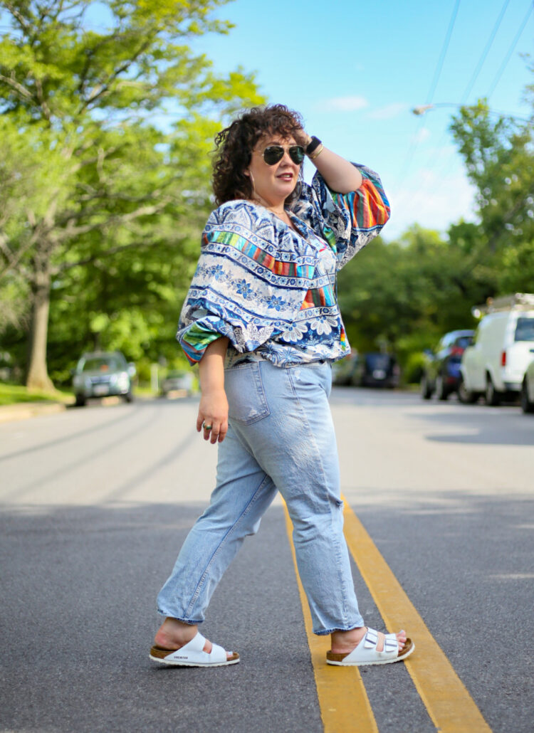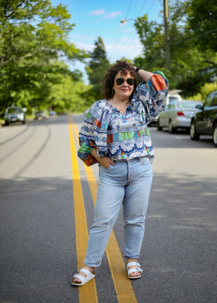 If you see me in person this late spring, there is a good chance you will see me in this outfit or a variation of it. Relaxed jeans that offer some airflow and flexibility, a lightweight cotton or linen top with interest, and Birkenstock sandals.