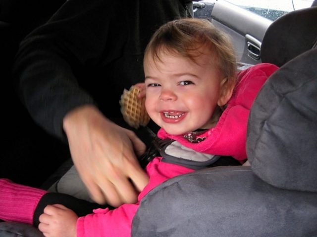 At two years of age, Emerson is a funny, smart, loving little person. Her hair is always in a fluff of curls and tangles on her head; she has yet to have a proper haircut, just a couple snips from my cuticle scissors to prevent a mullet. Her wardrobe is a combination of gifts from loved ones, 30% off sale merchandise from the Gap Give & Get promotion, and items I have collected from community clothing swaps, Freecycle, and consignment sales. She also wears clothes that I wore when I was her age – corduroy bell-bottom overalls, wool peacoats, hand-knit cardigans.