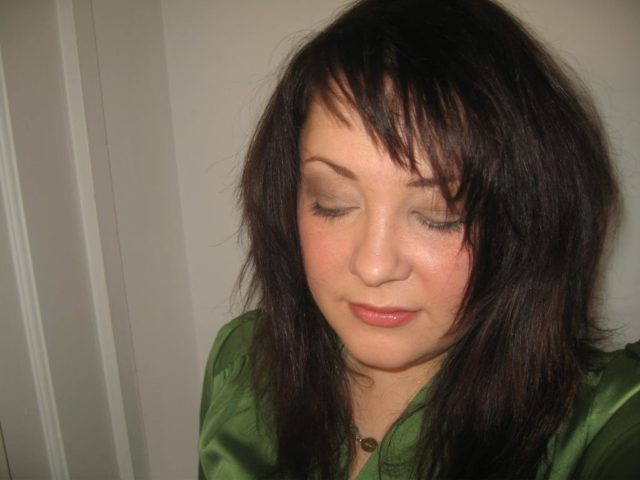 Makeup is Revlon ColorStay under eye concealer in Light Medium, philosophy The Supernatural in Beige, Nars blush in Orgasm, Revlon ColorStay shadow quad in Neutral Khakis – ivory in inner corners and on brow bone and olive on the lid and along lash lines, Revlon Super Lustrous Lip Gloss in Glossy Rose, two coats of Benefit's Bad Gal Lash on curled lashes.