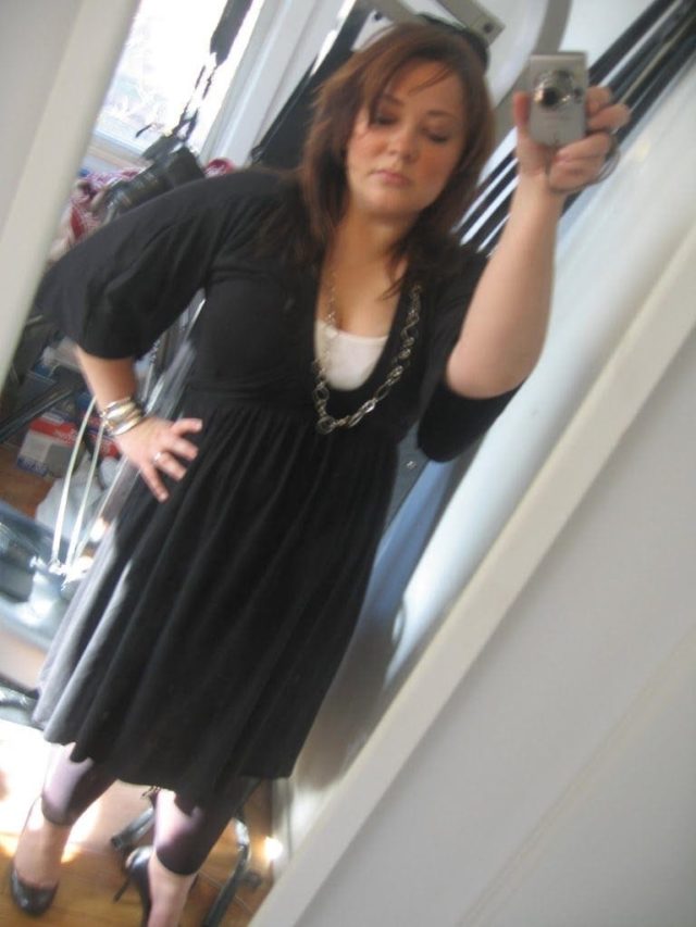 So I am wearing soft knits that are layered for warmth. White ribbed tank from J. Crew, Black jersey dress from Velvet Torch, black footless tights (that are baggy at the waist) from Old Navy, black round toe high heel pumps from Jessica Simpson, silver necklace from Ann Taylor Loft, silver cuff bracelet.