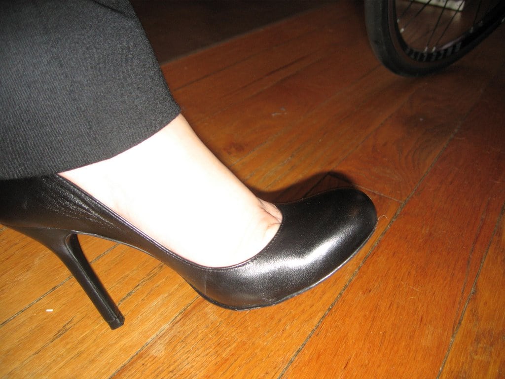 Black merino sweater from Banana Republic – those sweaters with the v so low it goes to the waistband. Under it, a black tank from Banana Republic. Black suiting trousers from Ann Taylor Loft (in a comfortable size 12 everyone!), and black high heeled round-toe pumps from Jessica Simpson. Silver multiple bracelet from Ann Taylor Loft, silver dangle earrings from Nordstrom, long silver chain bought at a renaissance festival, and long chain with pocket watch bought at Ann Taylor Loft.