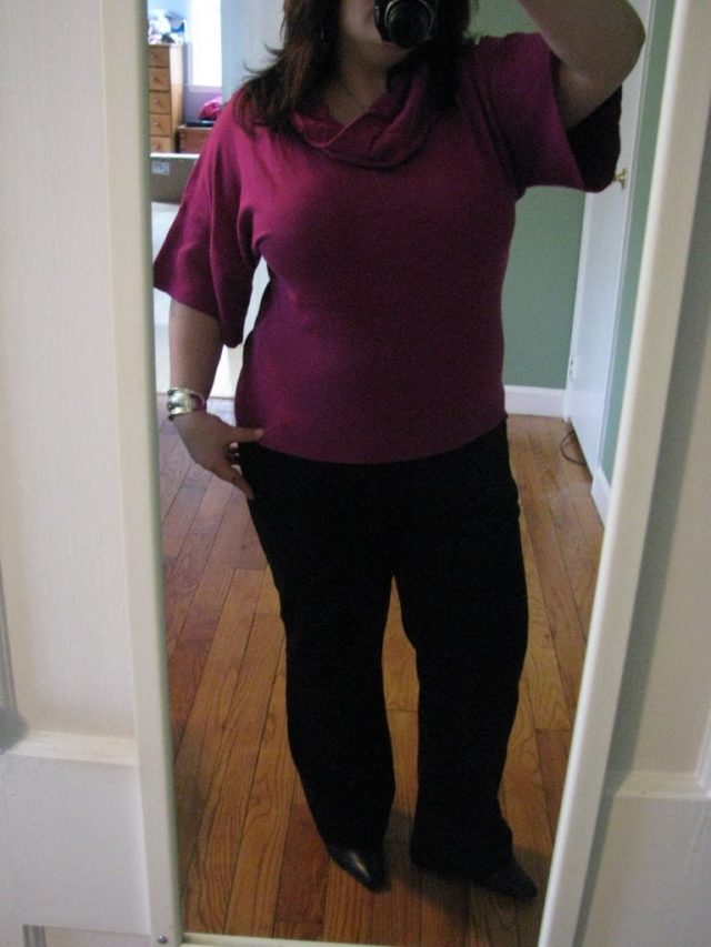 I wore a magenta dolman sleeve sweater from Nordstrom's sale rack and my black ponte maternity pants from Old Navy. Hair was washed and conditioned in a rush and dried just as fast. Makeup is the standard, except I used black shadow with an angle brush to look like liner, and wore Clinique's Longwear lipstick in Beauty.