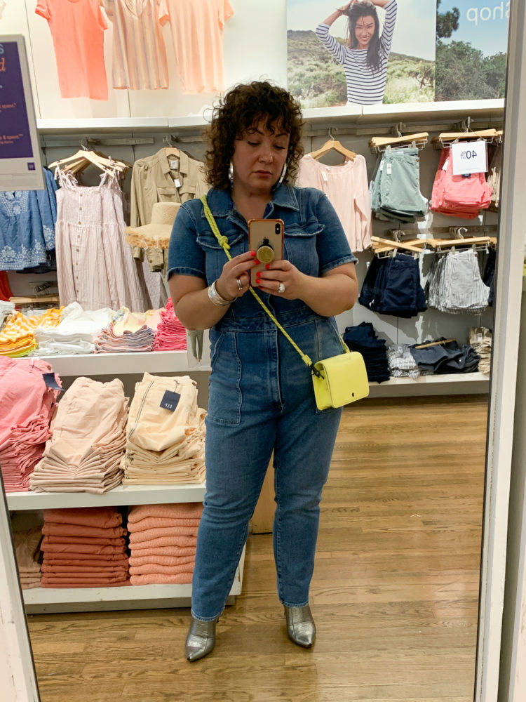 A quick scroll through my archives and you'll see I love overalls and jumpsuits. I've written before about a denim boilersuit I saw over a decade ago on the blog The Sartorialist that I have wanted in my closet. I bought a denim boilersuit, had it tailored, customized it with sequined wings on the back, it was never quite right but I wore the heck out of it until it no longer fit (stay tuned, it will soon be in my Poshmark shop). I've learned that I get so excited by the idea, but once it's in my closet it's not terribly practical. I'll choose dressy ones (the one here I've worn a dozen times), I'll choose breezy casual ones (like this one I recently featured), but denim… that's a toughie. But that's where renting clothing is awesome – I can rent a denim jumpsuit or boilersuit, keep it as long as I want, return it when I'm over it (or realize it's not right for me), or if I do fall in love with it, I can keep it. Needless to say, when I saw this Good American denim jumpsuit available in my size at Rent the Runway I added it to my next delivery.