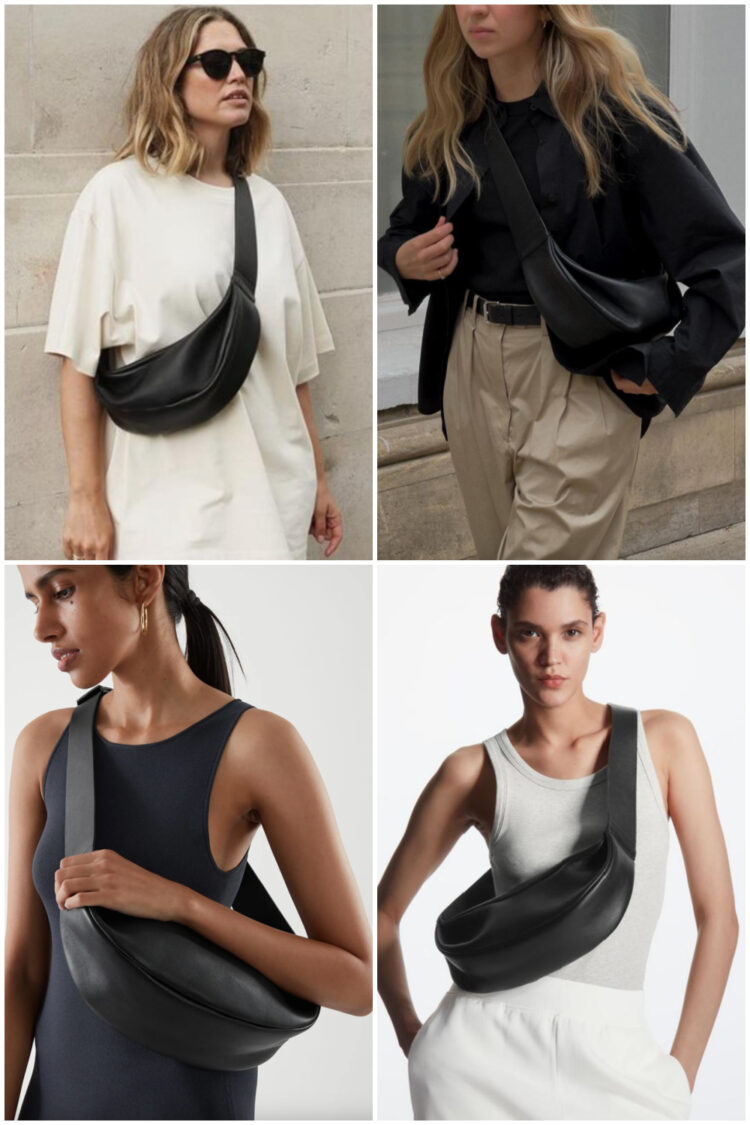 The Quince Italian Leather Convertible Crescent Shoulder Bag actually has two straps but I deleted one for this graphic because it is removable and looks more like The Row bag without it. However, this bag is super versatile since it does come with a shorter bag for under arm or hand carrying.