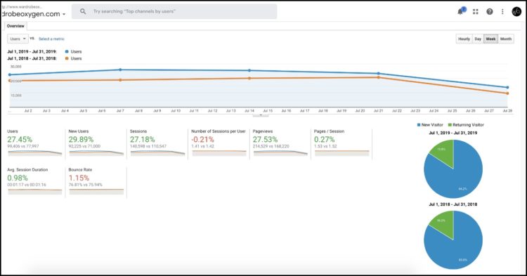 No surprise, this was the lowest income month of all year, a close second behind February which is notoriously low and I plan in advance for how dry it is. I didn't plan for this summer vacation from sponsored content so this was a bit painful. My saving grace was ad revenue, which was quite good as my traffic on the site was up 27.45% from last year (see the screenshot above from Google Analytics, comparing July 2018 to July 2019).