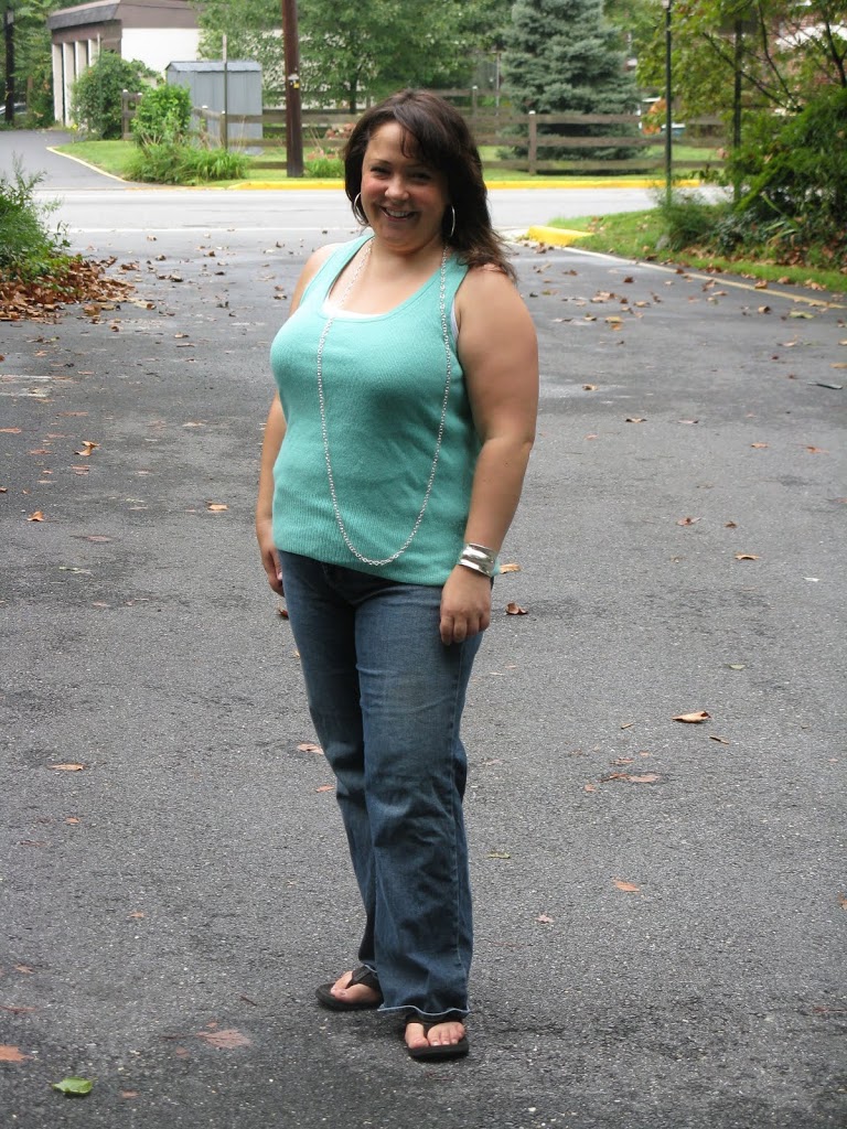 I am wearing an all-Gap outfit here. A white ribbed tank from this summer, a seafoam green cashmere tank that I bought on the clearance rack at Gap a couple years ago, and my Gap Essential jeans. Silver chain from Ralph Lauren, Reef “Sandy” flip flops.