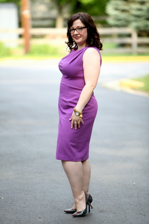 You all know I adore my Dobbin Clothing dress; I was excited to see their new Spring collection – fun new colors and silhouettes. Jessica at Dobbin Clothing was kind enough to send me the Sabrina Sheath in this perfectly springy shade of purple. It was just the ticket – I had a majorly stressful day at work yesterday and a long evening at a blog event (if you follow me on Facebook or Instagram you know what it was, the rest of you a post will be coming soon!). So to be able to have one-piece dressing this morning was so very needed, and it's nice to have it so easy yet look quite professional and be comfortable in high quality ponte knit. I thought it was going to be chilly and added the jacket, but it's actually colder in the office than outdoors!