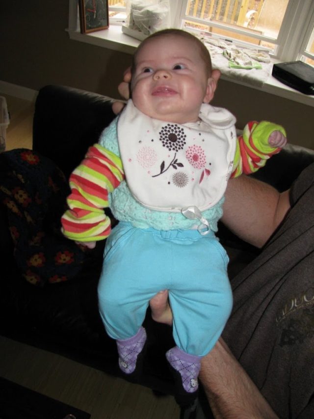 Emerson is adorable. Look how she is looking towards you while you are taking the picture (in her “daddy” outfit). She adores you! When I would nurse my little one (13 years ago) I would watch Dr. Brazleton on t.v. and he would talk about how their eyes follow you! Exactly what Emerson does!