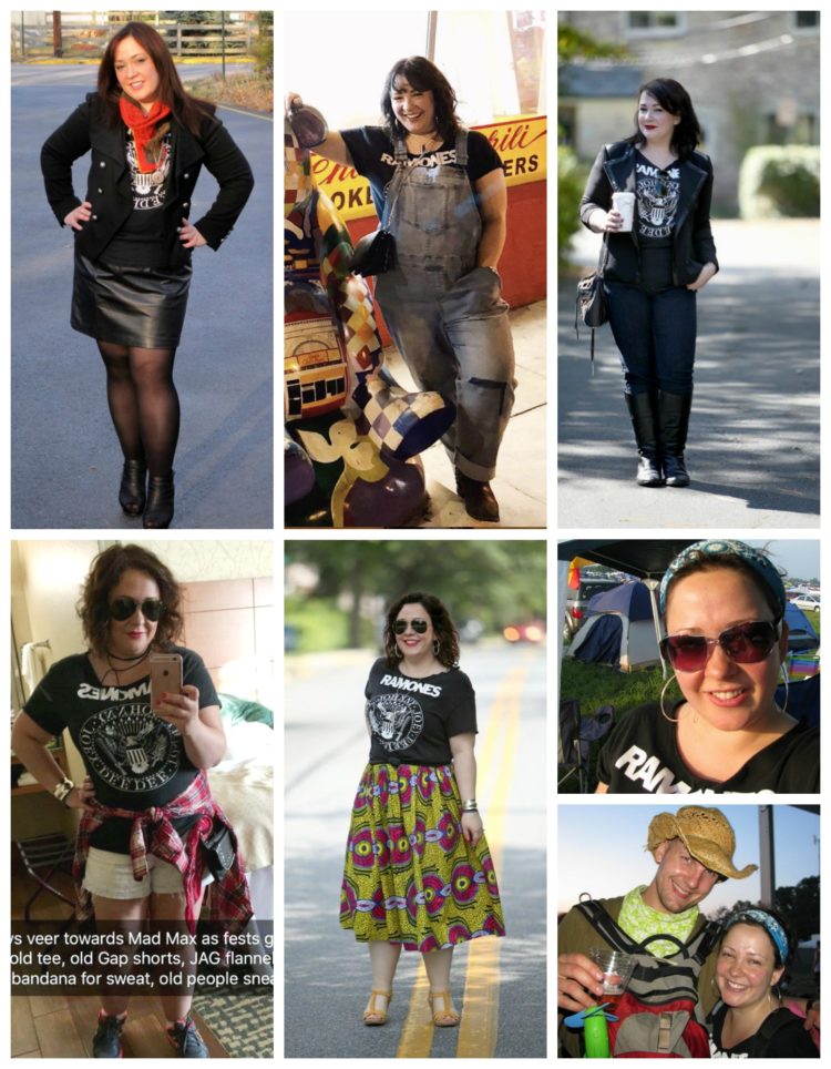 I know I’ve had this shirt for at least 15 years but I think it’s more like 20 or more. I bought this sometime after college. It was a crisp black t-shirt with the classic Ramones logo on it. I washed it a million times and it still was crisp and black. I cut off the neck and the hem of the sleeves. I soaked it in salt water. I lay it out on the deck to get bleached by the sun. It helped a bit but was still very crisp and new. So I just started wearing it every chance I could so it would break down with sweat and warmth and washings. After one summer, it looked cool enough to take it from aerobics class and working in the yard to wearing it out with jeans. And now, it’s one of my beloved t-shirts. It’s perfectly cut up and weathered and worn and now I’m afraid to wash it for fear it will push it over the edge. It’s been to every single music festival I have attended, and been worn to several other concerts. I wear it under blazers and under overalls, with ball skirts and leather leggings. I wore it when I was a size 10/12 and when I was a size 16. It was worth the effort.