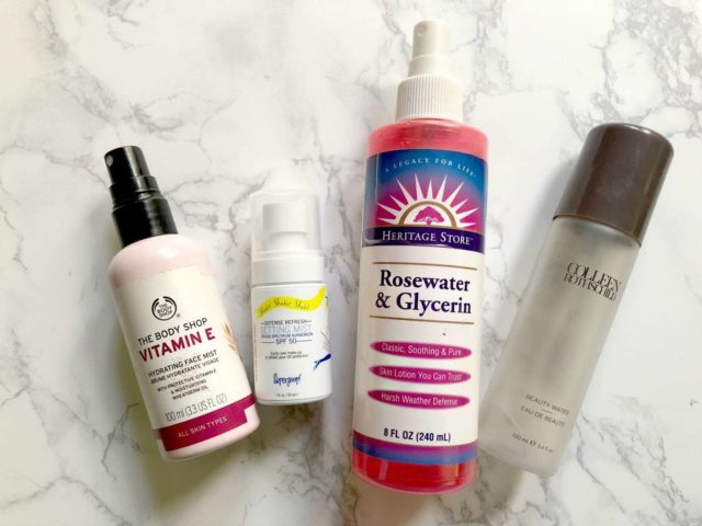 I mist my face all the time. I have a bottle of Colleen Rothschild’s Beauty Water in my commuting backpack and one on my dressing table. I have a bottle of Supergoop in my purse’s cosmetic bag. I have Body Shop Vitamin E mist and traditional rosewater with glycerin sitting on my dressing table, and usually one or two at my desk.