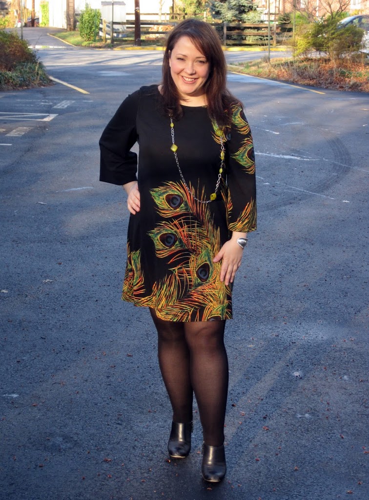 That is a gorgeous dress – and really looks fantastic on you. I absolutely love the peacock feathers!!