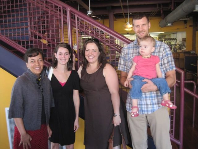 After we stopped by Franklin's for lunch and I bumped into two women who went to high school with me!  One was in town from Hawaii, the other I hadn't seen in eons so it was a fantastic mini reunion!  Here I am with them, my husband and Emerson!  As you see, I re-wore my new brown dress from Merona for Target.