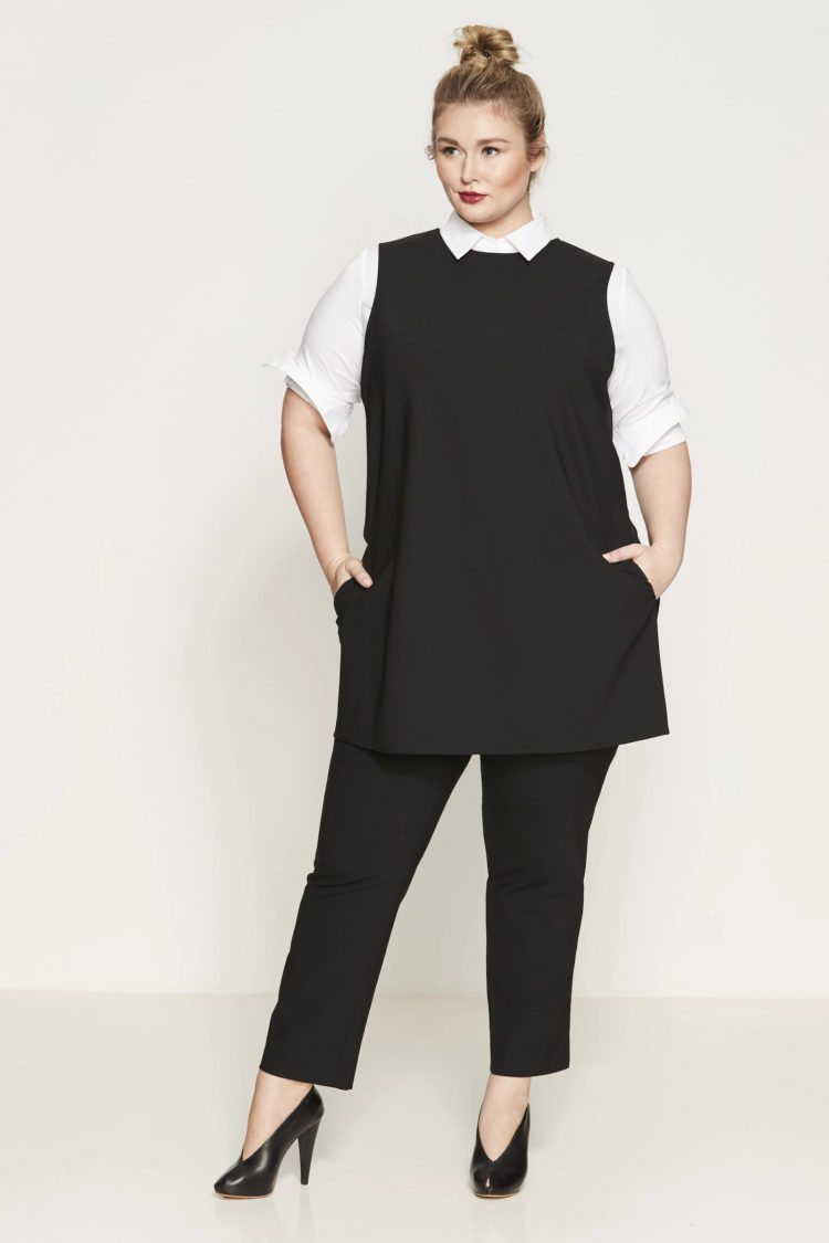 When I went to New York City for NYFW, I had the pleasure of visiting the headquarters for Pari Passu, a luxury plus-size clothing brand. I was able to see where the clothes are made, see mood boards for their upcoming collection, and the brand's famous dress forms created from the 3D body scans of over 7,500 adult American women sized 12 and up. While there, Shanna, the founder, gifted me the brand's Lucie Tunic and Merit Flat Front Pants.  I had seen this look on Shanna with a crisp white shirt underneath, I've seen it on Kristus from the blog Homeschool in Heels; the tunic with distressed boyfriend jeans, over a turtleneck and crisp white shirt, the two pieces over a crisp blue shirt (you can see all her styles on her Instagram). I was excited to style it.