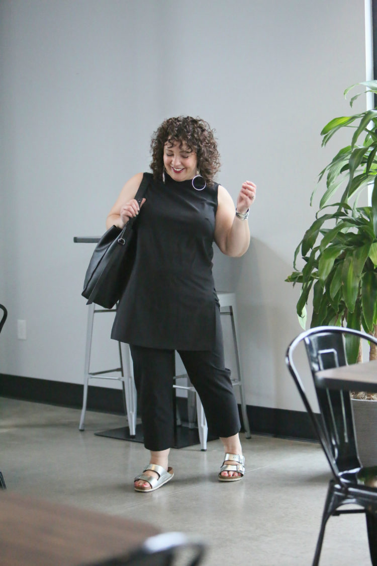 On a day when I was going from a doctor's appointment to errands to an outfit shoot to a coffee meeting to picking our kid up from school, I wore this set with my beloved silver Birkenstocks and a silver statement earring (no longer available but these are a cool alternative). My black leather tote from ALLSAINTS (several years old; this is a similar one from the same brand) carried my laptop and other necessities and worked well with the modern outfit.