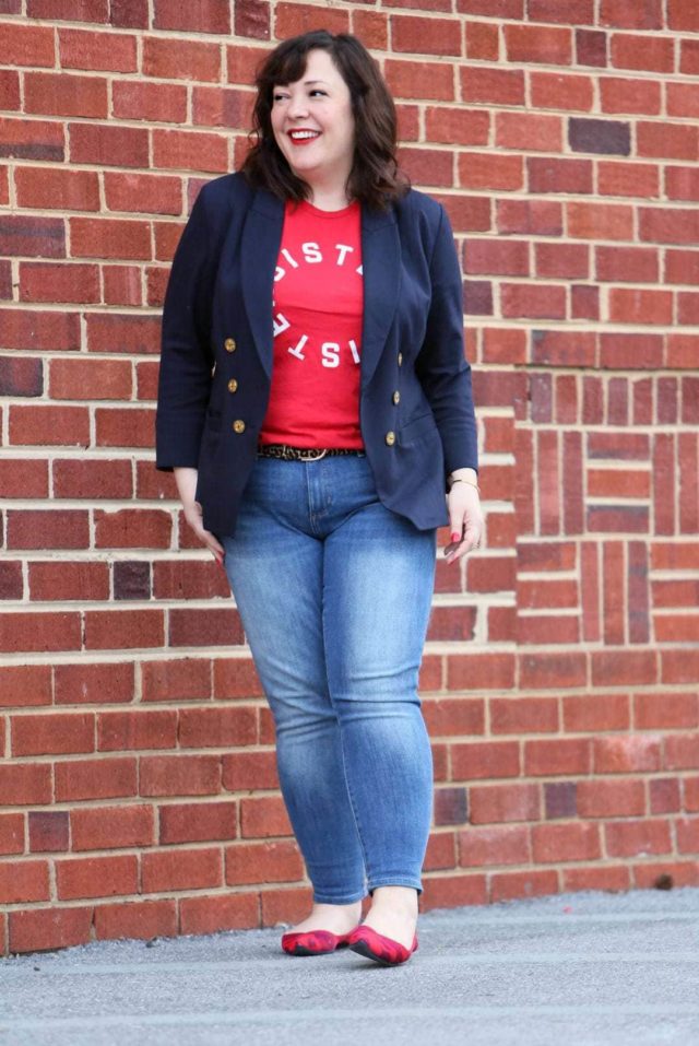 While I wear plenty of my political t-shirts to the gym, they can also be dressed up for the weekend. Adding a stretchy ponte blazer and stretchy pointed-toe flats provides polish without sacrificing comfort. Jeans regularly stretch out on me throughout the day; wearing a belt helps them stay up and stay the right shape. I swear by a Beltaway under tops, but when tucked in I like a bit of a statement.