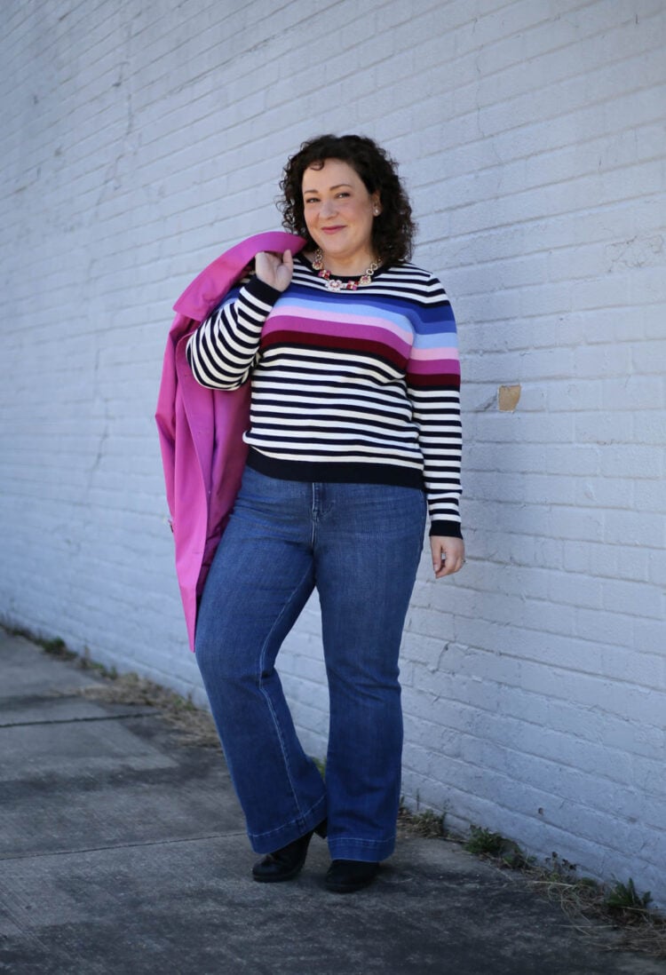Pink Mac-style raincoat and striped sweater from Talbots on Wardrobe Oxygen
