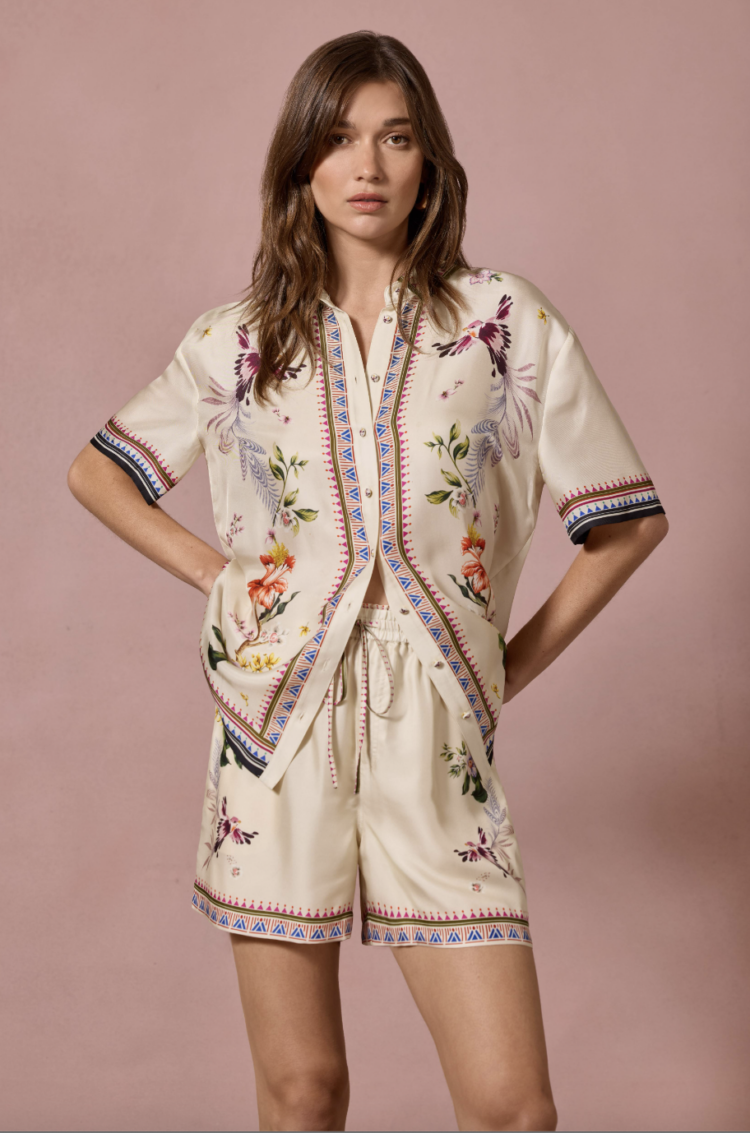 This retro yet elevated camp shirt and shorts from Johnny Was