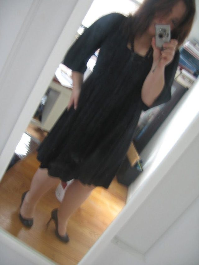 Black jersey dress from Velvet Torch with black synthetic cami from Victoria's Secret underneath. Black coral necklace from Mexico thanks to the hubby, black round-toe high heeled pumps from Jessica Simpson.