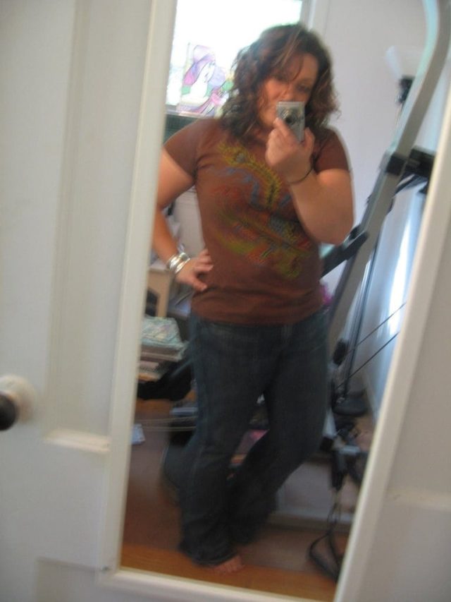 Brown silkscreened tee from Target, Curvy Flare jeans from Gap, teal sueded wedges from Seychelles.