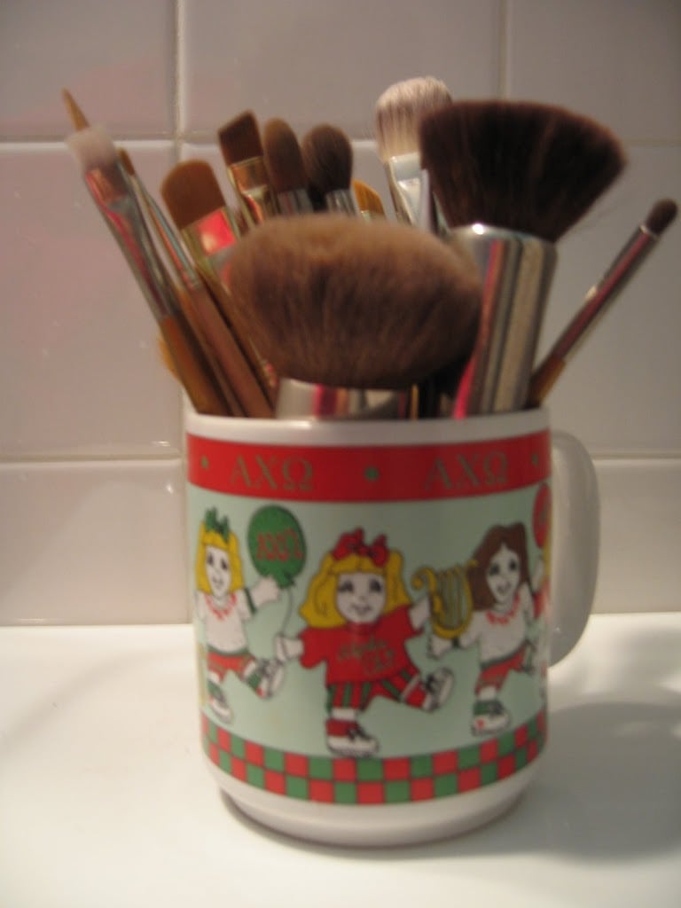 I also have a decent collection of brushes. High-quality brushes rarely need to be replaced if cared for. Nothing classy, these brushes are stored in a coffee mug from my college sorority.