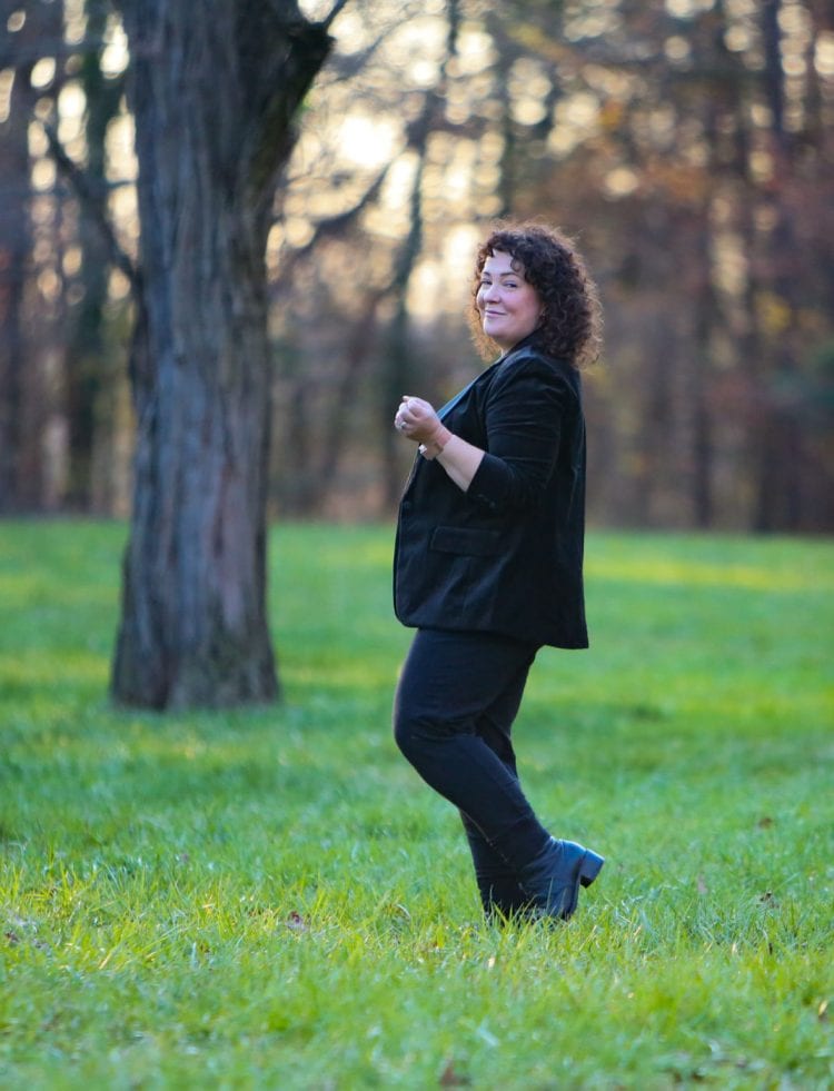 As for the rest of this look, I'm glamming up the ordinary. The black velvet tux blazer is from LOFT. I mentioned it in this Friday Shop about where to find velvet pantsuits and LOFT was kind enough to send me one. I have the size 14, I think it runs a bit snug but is cute and a great way to glam up the ordinary or quickly create a festive ensemble.