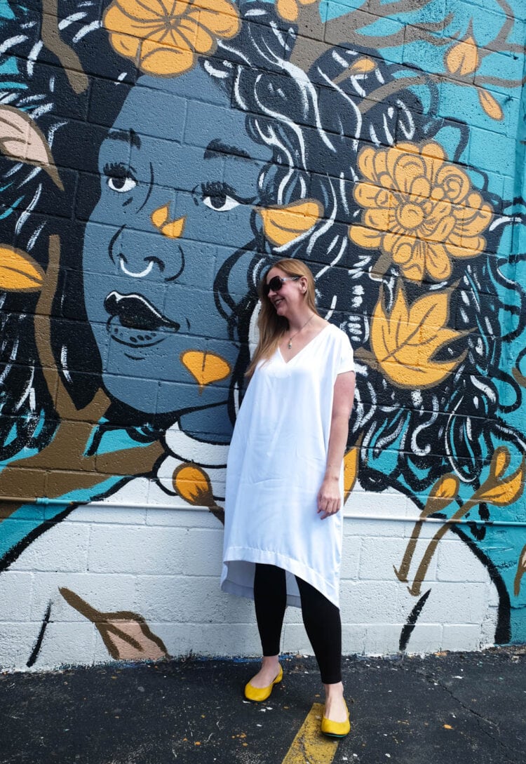 In the spring, I would style this dress as I have here, with leggings and flats, and maybe a long drapey sweater, but in the summer, I would ditch the leggings and just wear a fun pair of sandals.