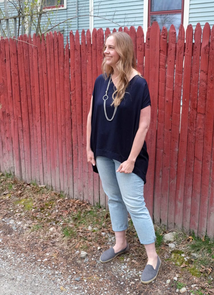I settled on pairing this tunic with a pair of faded boyfriend-style jeans and loafers, with a statement necklace. I have a casual workplace, so I wore this outfit to work the next day.
