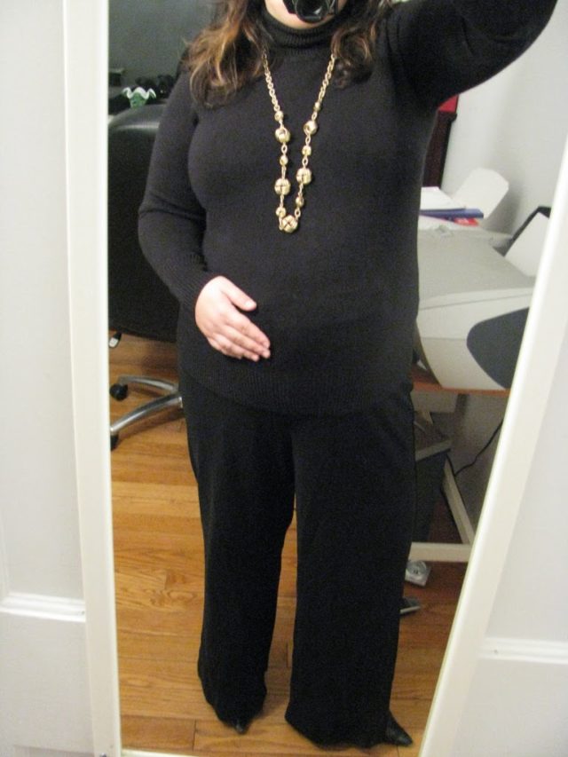 My other bargain from the Motherhood Maternity Outlet in Rehoboth Beach – only $9.99 and super soft! The pants were given to me by a friend – with a safety pin they work as maternity pants. Pretty cool since now the only shoes that fit me are these booties and my Duo boots and I had an important conference today where I had to dress in a manner more professional than casual leather boots and I am down to just a couple of black pants that are all in need of a washing. I caved in and ordered some new shoes in a wider and larger size, they should arrive next week. I had to return the round-toe wedges from Report – after two wearings with bare legs and a few wearings around the house in socks they still tear up my ankles to the point that I can't wear any other pumps for two weeks. Not cool at all.