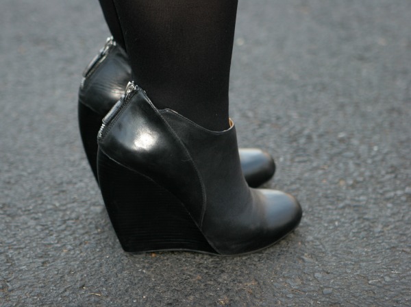 Dress: Felicity & Coco | Jacket: Hinge | Tights: Nordstrom | Booties: Nine West | Silver cuff | Lipstick: Revlon Matte in Wine Not