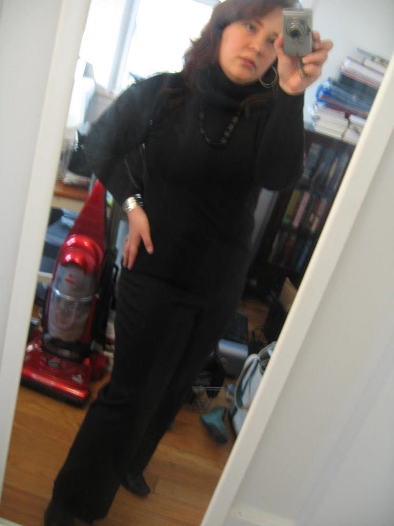 That evening, I had to race home and change for the funeral for a good friend's stepfather. The dog greeted me, shedding all over myCaslon trousers, so I changed to my wool-blend ones from Ann Taylor Loft. Most of my clothes are in need of a wash so i wore my black merino turtleneck from Ann Taylor, black coral necklace from Mexico, black city boots from Impo. I added some Chanel pressed powder to even out my skin tone, brushed my hair with a wood-bristle padded brush, added some Revlon ColorGlide Sheer in Sheer Burgundy.
