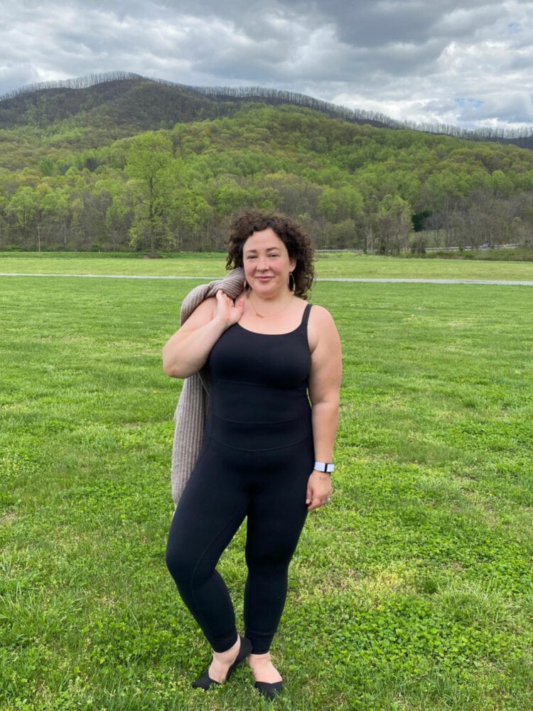 Thank you so much, Alison! I wrote to you before thanking you for your honest opinions, and ordered this bodysuit. I wanted to let you know i LOVE it. I really do. I’ve lost some weight, and though I’ve plateaued I’m still happy with 16 lbs gone. I’m 5’1″, 38 DDD chest, hourglass figure and took a chance and ordered the small (SMALL. I”ve never been so thrilled!)’ When it came, I was skeptical but omg…this is the most comfortable piece of clothing ever. Today I tried to without a bra and it’s a lot like a simple sports bra: enough support that I’m not bouncing all over but I wouldn’t go braless in it for anything other than casual errands. I do wish it was a little snugger behind my knee, but oh, how I love this piece. Thank you again so much!!!