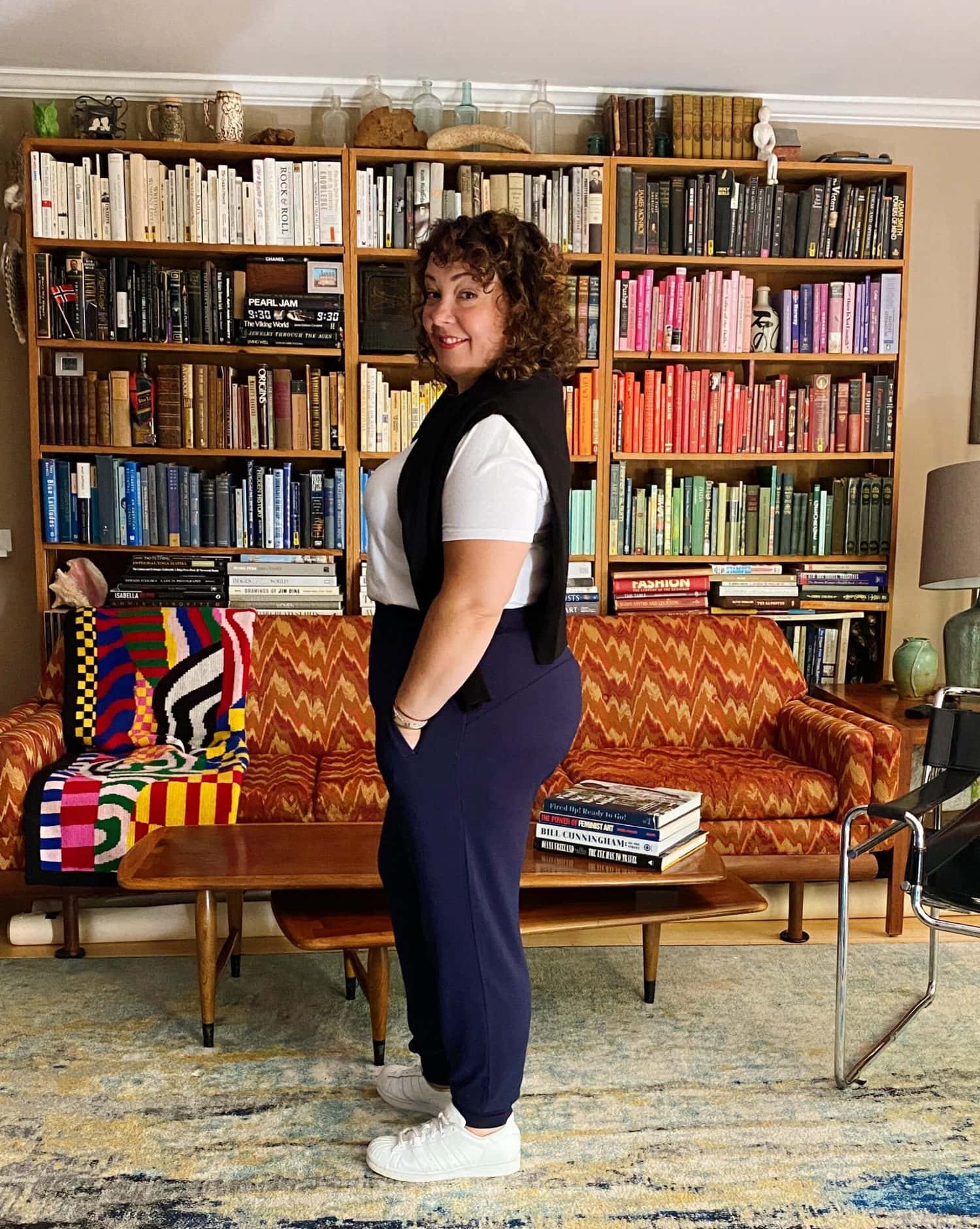 I am using six pieces from the Universal Standard Sample Sale as well as the Universal Standard Tee Rex, which in my opinion, is the best white tee shirt out there. It is opaque, the sleeves a hair longer which dresses it up (I sometimes roll them for a casual look). Not boxy but not fitted, a silky finish, washes like a dream, and a curved hem so it looks fab untucked or tucked in.