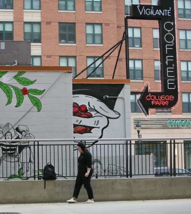 These photos were taken at the new Vigilante Coffee in College Park, Maryland. When I went to the University of Maryland, this building was the liquor store in town with a drive-up window. Nearby was a weird McDonald’s where the window was on the wrong side, and some other sketchy establishments. Now, all of those buildings have been torn down and replaced with tall apartment buildings with restaurants and shops on the main floor. Vigilante College Park is tucked away between them all, a little oasis (with a little free parking lot for paying customers!). the interior is small, but well designed to maximize space. Blue tile and wood accented with plants and their signature skateboard decks makes it a charming place to grab a cup of coffee with a friend, or telework for a little while.