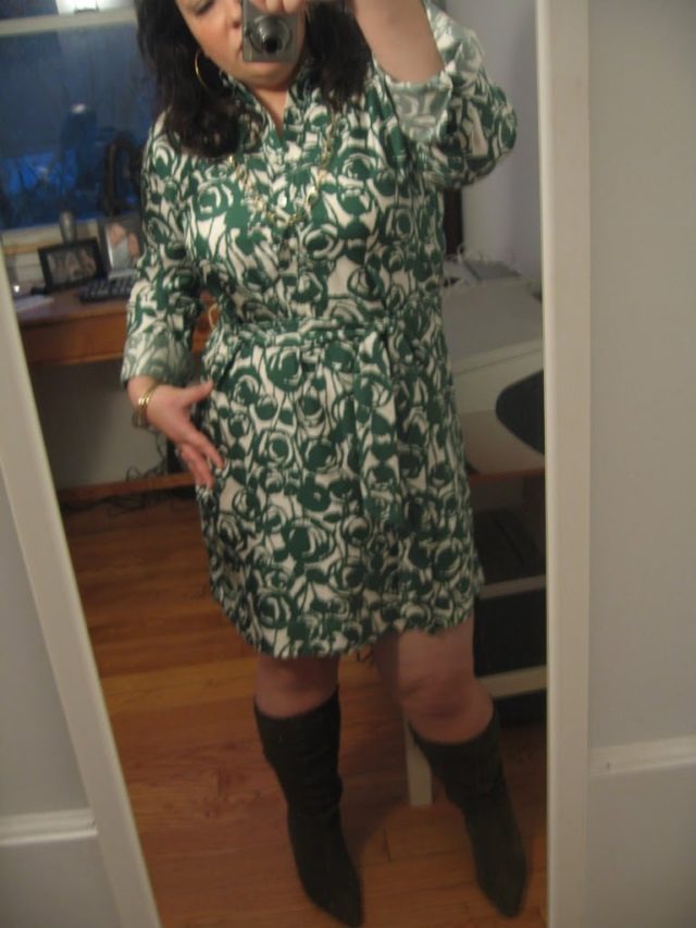 Green and ivory print silk shirtdress from Banana Republic, brown suede slouchy boots from Silhouettes, gold bangles from Ralph Lauren, gold hoops and necklace.
