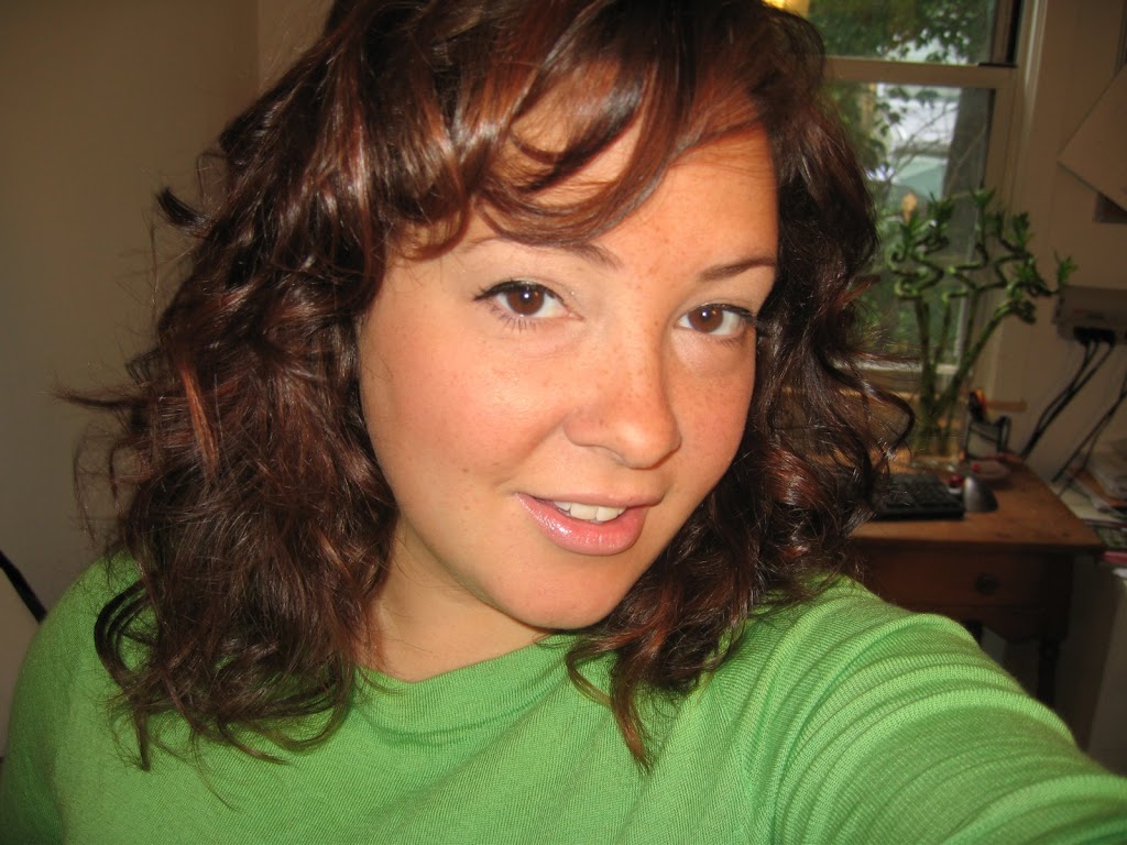 Makeup is Body Shop bronxing powder in Light over whole face, Nars blush in Orgasm on the apples of the cheeks. On eyes is the Revlon ColorStay shadow quad in Neutral Khakis – ivory on inner corners, khaki on lids. Lashes curled, Max Factor's Lash Perfection in Black applied and then a line of Maybelline Ultra Liner in black on top lash line. Lips is the L'Oreal Juicy… some lipstick in a silver case and it's Strawberry something. I forgot it at home and have been reapplying with Revlon's Super Lustrous Lip Gloss in Pink Afterglow.