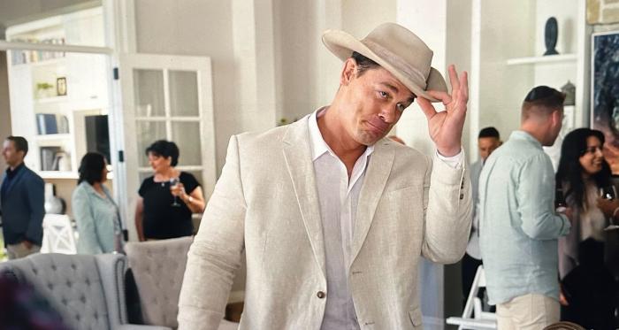 John Cena as Ricky Stanicky, in a linen suit, white shirt, and a safari hat
