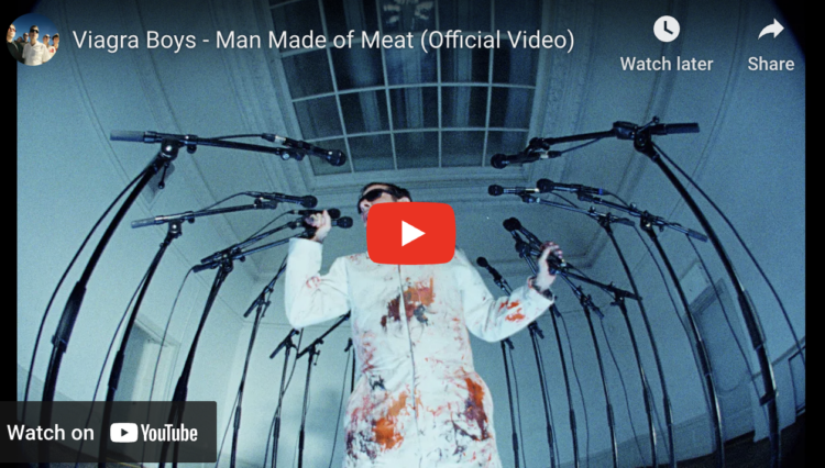 Viagra Boys is a Swedish punk band that started in 2015. Their latest album, viagr aboys, is coming out in April but they dropped their first single from it this week. “Man Made of Meat” and its corresponding video has so much you may find yourself rewatching and relistening to capture everything. Did they say, Chandler Bing? What does his forehead tattoo say? It's a cynical song about modern life under capitalism and feels very on the nose for 2025.