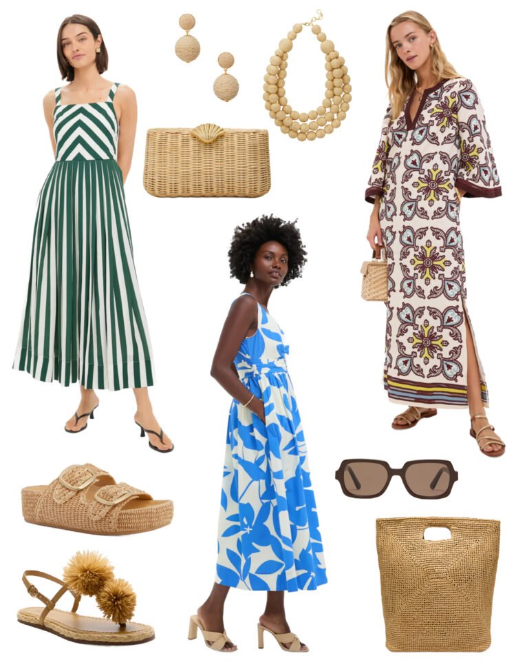 stripe dress (2XS-3XL) | earrings | necklace | clutch | caftan dress (2XS-4XL) | two-strap sandals | pom pom sandals | blue dress (XXS-XXL) | sunglasses | raffia tote