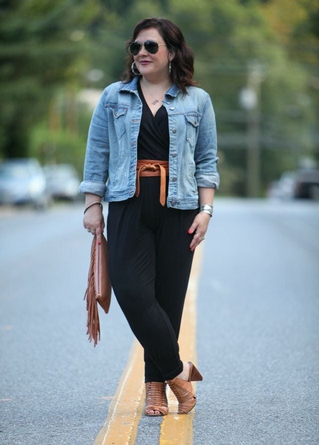 Wardrobe Oxygen wearing a J.Crew Factory denim jacket, Loveappella jumpsuit, BCBGeneration fringe clutch, and ADA Collection wrap belt Wardrobe Oxygen featuring a J. Crew Factory denim jacket Wardrobe Oxygen featuring a BCBGeneration fringe clutch, J. Crew Factory denim jacket, and Vince Camuto sandals Wardrobe Oxygen featuring a black jersey jumpsuit, denim jacket, and cognac sandals and belt Jacket: J. Crew Factory | Jumpsuit: Loveappella (similar in plus size) | Belt: ADA Collection (similar) | Shoes: Vince Camuto (similar, low heel alternative) Bag: BCBGeneration (c/o HSN but sold out on their site so linked to where on sale at Amazon) | Sunglasses: Ray-Ban | Bracelet: Had forever (similar) | Rings: Etsy, Etsy, Etsy | Earrings: Etsy