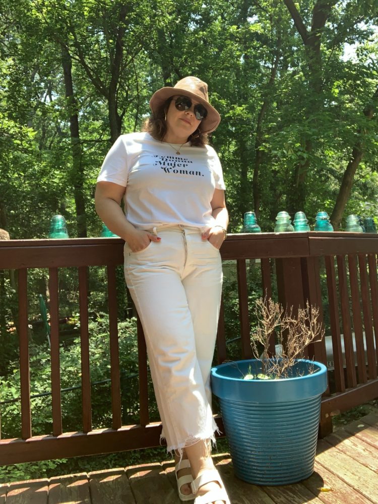 Shirt: Banana Republic (L) | Jeans: American Eagle (14; old, same jean but different color) | Shoes: Birkenstock | Earrings: Cassie Hoops c/o Chico's | Hat: Stetson c/o Tenth Street Hats | Sunglasses: Ray-Ban | Necklace: Modernist Monogram Pendant c/o Jenny Bird